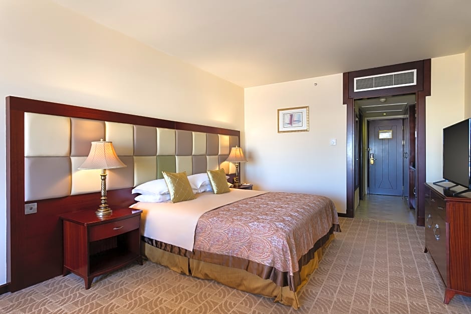 Double deluxe partial sea view is 355 square feet and includes either a king-size bed 150-183 width or 2 single beds 80-130 width plus desk, satellite tv , hairdryer, tea and coffee making facilities , and safe.